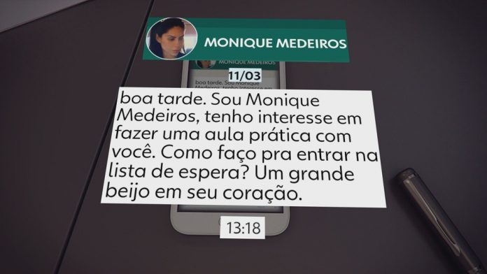 Já a procura pelo curso de culinária se deu no dia seguinte, o que encontrou uma professora nas redes sociais e questionou: “Boa tarde. Sou Monique Medeiros, tenho interesse em fazer uma aula prática com você. Como faço para entrar na lista de espera? Um grande beijo em seu coração”.