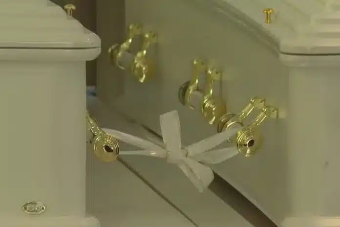 Uma fita branca com alianças uniu dois caixões de um casal vítima da queda do avião ATR-72 da Voepass, em Vinhedo (SP), na sexta-feira (9). O acidente aéreo deixou 62 vítimas, sendo 58 passageiros e quatro tripulantes.