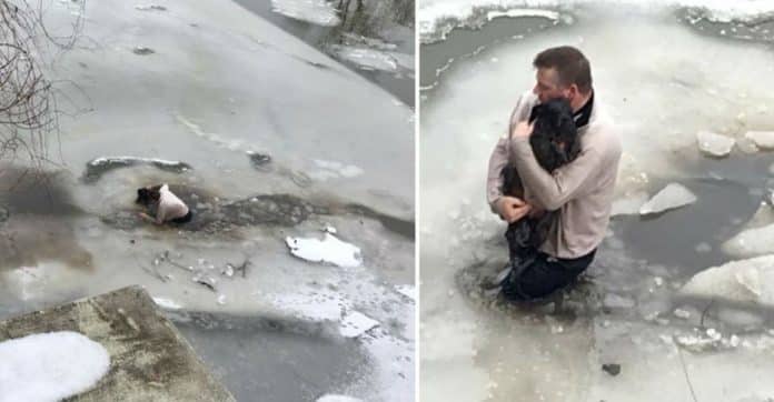Um homem de grande coração não pensou duas vezes em pular em um lago congelado para salvar a vida de um cachorrinho que estava se afogando.