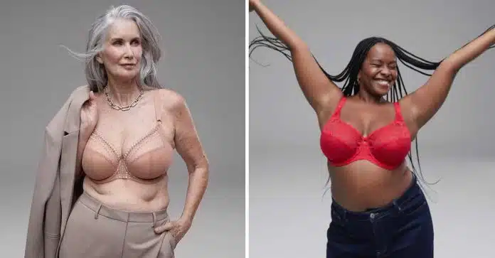 Além disso, a marca também incluiu uma mulher mais velha que tem cabelos completamente grisalhos, manchas senis e rugas. Outra coisa que chama a atenção é que a marca oferece sutiãs para todos os tamanhos, com uma variedade bem ampla.