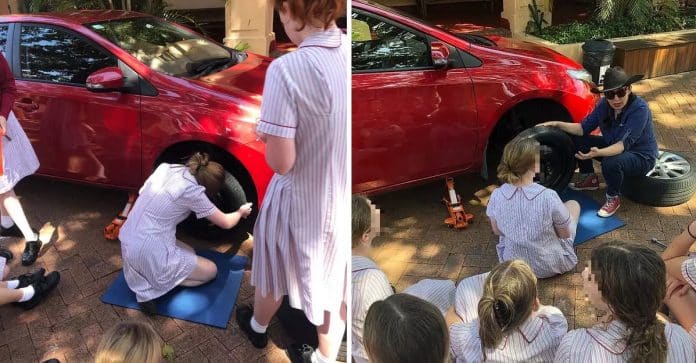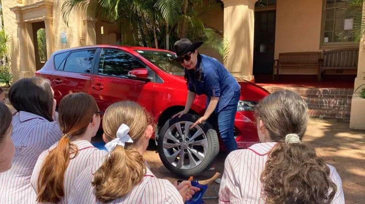 Um exemplo disso é a troca de um pneu, porque essas meninas não vão esperar que alguém as ajude no futuro, elas vão conseguir fazer sozinhas rapidamente.