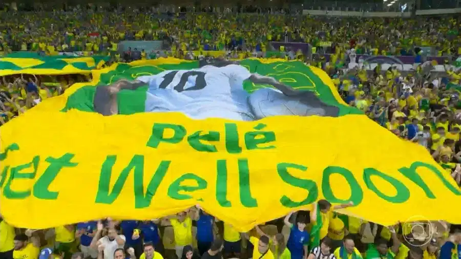 Vibrando positivamente pela recuperação de Pelé, a torcida brasileira fez uma homenagem no último jogo da seleção, sexta-feira (2), no jogo contra Camarões, no Estádio de Lusail, na Copa do Mundo 2022. Uma grande bandeira trazia a imagem do jogador e a frase “Fique bem logo”: