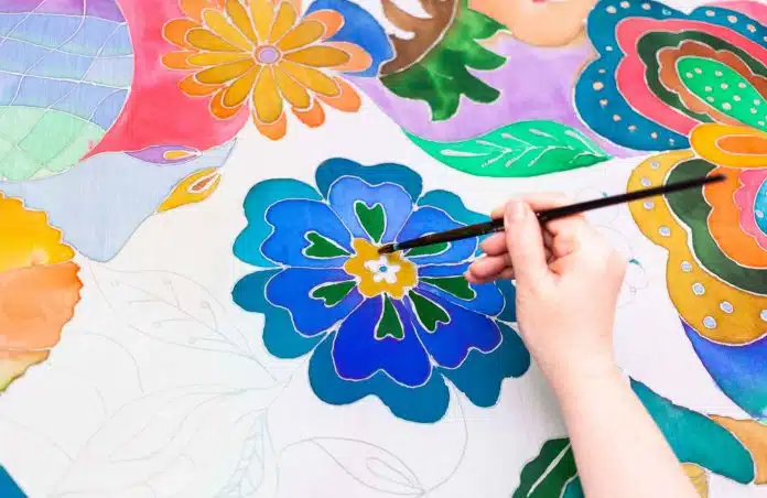 A tinta aquarela para tecido oferece efeitos suaves e translúcidos, similares às pinturas com água. Requer mais técnica, pois o seu baixo teor de pigmento exige camadas cuidadosas, ideal para os projetos artísticos, como paisagens e ilustrações delicadas em tecidos mais claros.