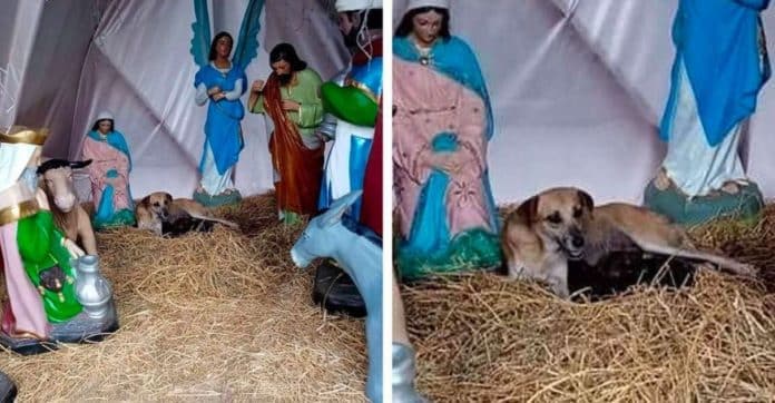 No início desta semana, um doce cão vadio evidentemente notou a cena da Navity – e decidiu reivindicar a manjedoura dentro dela como sua.
