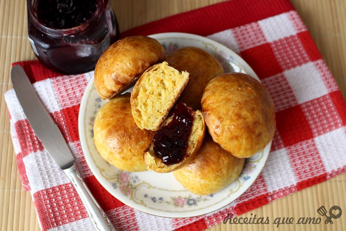 Em seguida, leve para assar em forno pré-aquecido a 180ºC por cerca de 30 minutos ou até que os pães estejam bem dourados.