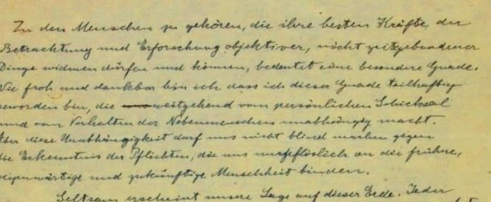 É uma bênção especial pertencer entre aqueles que podem dedicar suas melhores energias para a contemplação e exploração de coisas objetivas e atemporais. Quão feliz e grato eu sou por ter recebido essa bênção, que dá um grande grau de independência em relação ao destino pessoal de alguém e a atitude de seus contemporâneos. No entanto, essa independência não deve nos habituar à consciência dos deveres que constantemente nos prendem ao passado, presente e futuro da humanidade em geral.