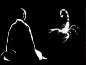 Narra a lenda que dois monges caminhavam rente ao rio quando um deles avistou um escorpião que se afogava. O jovem apressou-se e, de ímpeto, tentou retirar o escorpião da água com sua própria mão e o escorpião o pica. O monge, sob o impacto da dor, deixa o escorpião novamente cair na água. Logo em seguida, o mesmo monge olha e o escorpião está a ser levado pelas correntezas e então, valendo-se de um galho, novamente retira o escorpião do rio e o coloca a salvo…