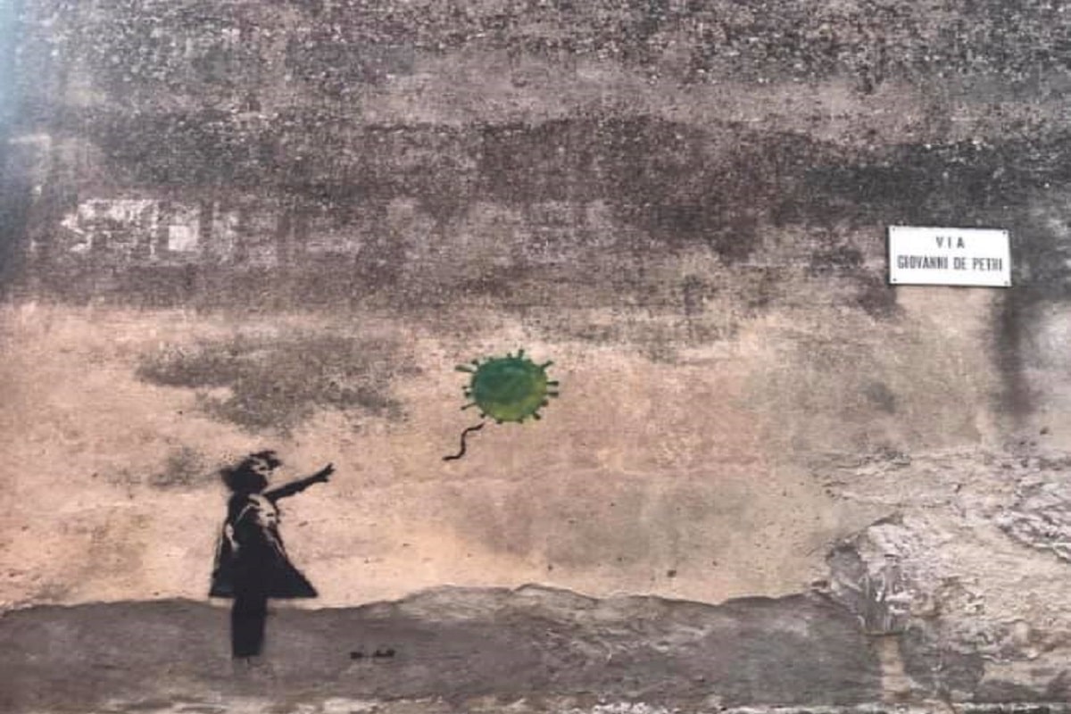 A obra, que lembra o famoso mural de Banksy “Uma garota com balão”, foi compartilhada na página do município no Facebook e está localizada em uma parede antiga no cruzamento da Via De Petri e da Locatelli. Em vez do balão vermelho, no entanto, existe um verde na forma de Covid-19. O grafite foi interpretado pela administração como um sinal de bons desejos.