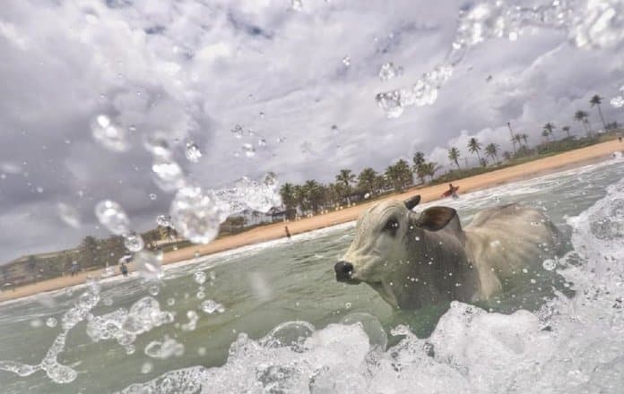 O surfista Douglas Pedrosa estava na praia, fez imagens e relatou o caso no Facebook: “Estava surfando e fazendo imagens com uns amigos e de repente ouço minha amiga gritar: ‘Doug, um boi!'” Sem acreditar, ele achou que era brincadeira. “Foi então que vi o boi”, conta.