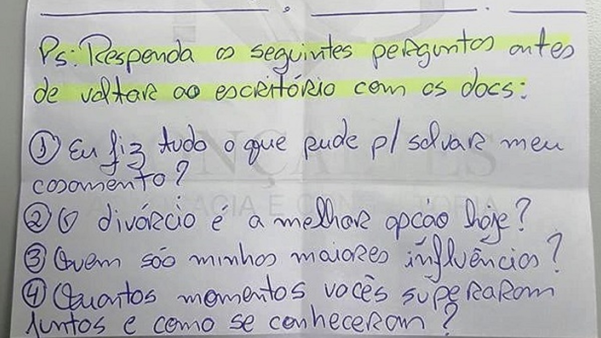 Diante disso, ele fez uma proposta. No papel em que anotou os documentos necessários para o processo legal de separação, Rafael escreveu também quatro perguntas que a mulher deveria se fazer antes de prosseguir. “Expliquei as perguntas, e disse para ela pedir para o marido responder também”, relembra ele.