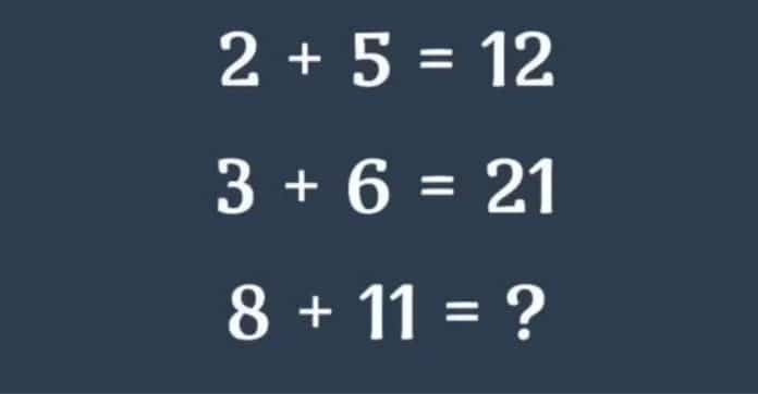 Os cálculos apresentados são: 1 + 4 = 5, 2 + 5 = 12, e 3 + 6 = 21. O desafio é descobrir quanto é 8 + 11. Naturalmente, todos sabemos que 8 + 11 é 19, mas esta não é a resposta esperada pelo enigma.
