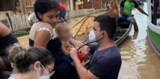 Em meio da cheia de rio, médico atende bebê dentro da água