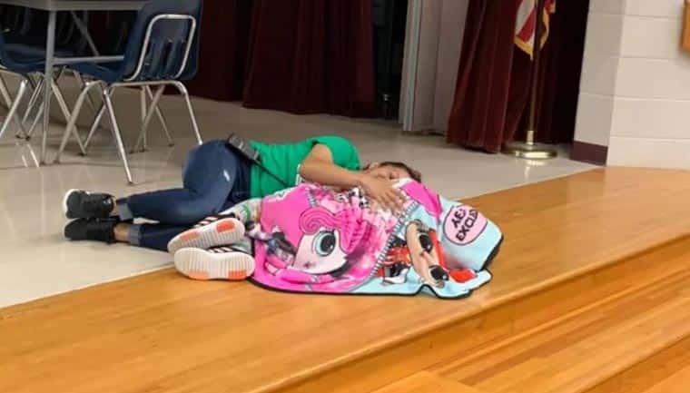 A pequena Kenlee Belew-Shaw ficou incomodada depois de se atrasar em sua rotina diária no colégio, aí subiu no palco da cafeteria com o cobertor que leva para a escola, deitou e começou a chorar.