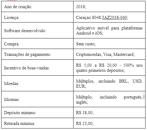 O cassino on-line 1Win, licenciado em Curaçao, opera legalmente no Brasil desde 2016 com a licença número 8048/JAZ2018-040. O fato de os usuários poderem baixar o aplicativo do cassino para os sistemas operacionais iOS e Android o diferencia da concorrência no setor. A aposta do bookie tem um valor mínimo de depósito de R$18,00 e um valor mínimo de saque de R$23,00. Ganhe um bônus inicial de 500% no seu primeiro depósito ao criar uma conta no 1Win: