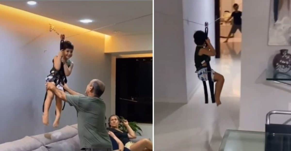 Como? Graças ao avô, Israel Taboza de Melo, 65 anos, que construiu uma tirolesa para o neto dentro do próprio apartamento, na praia de Candeias, em Pernambuco.