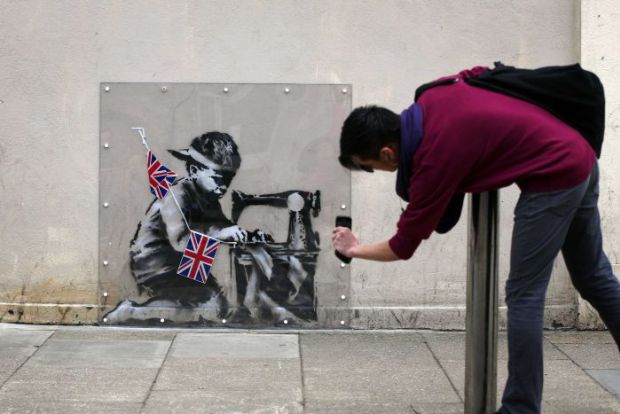 Banksy, “grafitter”, pintor, ativista político e diretor de cinema britânico, é conhecido mundialmente por espalhar obras de arte irreverentes nas ruas, que modificaram concepções, incitaram à reflexão e alteraram a forma como os “graffitis” são vistos hoje em dia. O artista dá cor às ruas com “graffitis” de diferentes estilos, instalações, “stickers” e outros gêneros de projetos artísticos, que têm o propósito de elaborar duras e sarcásticas críticas à política, à sociedade em geral e à guerra do mundo contemporâneo.