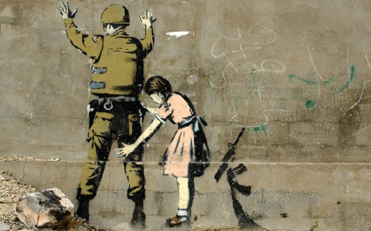 Banksy, “grafitter”, pintor, ativista político e diretor de cinema britânico, é conhecido mundialmente por espalhar obras de arte irreverentes nas ruas, que modificaram concepções, incitaram à reflexão e alteraram a forma como os “graffitis” são vistos hoje em dia. O artista dá cor às ruas com “graffitis” de diferentes estilos, instalações, “stickers” e outros gêneros de projetos artísticos, que têm o propósito de elaborar duras e sarcásticas críticas à política, à sociedade em geral e à guerra do mundo contemporâneo.