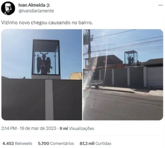 Trata-se de uma criatura com corpo humano, asas e cabeça de bode. “Vizinho novo chegou causando no bairro”, brincou o internauta, cujo post já ultrapassou 10 milhões de visualizações apenas no Twitter.
