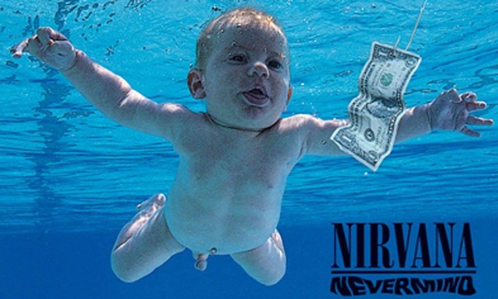 A capa do disco “Nevermind” (1991) mostra Spencer Elden aos quatro meses de idade, nadando nu em uma piscina, aparentemente tentando alcançar uma nota de dólar presa em um anzol.