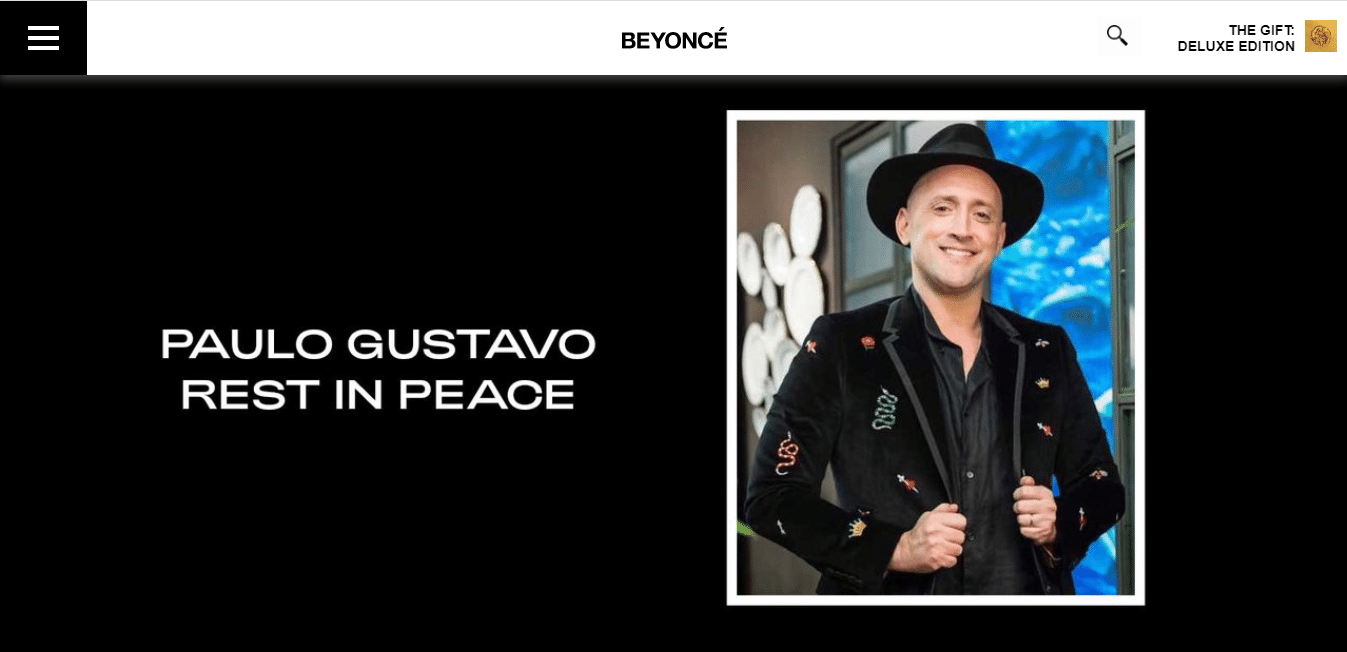Na primeira página de seu site oficial, Beyoncé publicou uma foto de Paulo Gustavo com os dizeres: “Paulo Gustavo Rest In Peace” (Paulo Gustavo Descanse Em Paz).