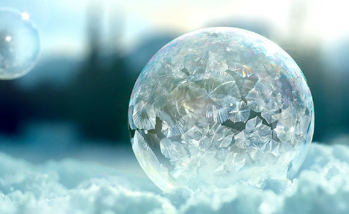 Assim que são lançadas ao ar, as bolhas se tornar finas esferas de gelo, até que a estrutura não se sustenta mais e as bolas se partem em micro cristais!
