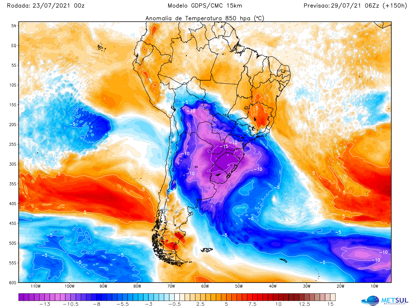 A presença de nuvens em alguns dias pode fazer com que algumas cidades de maior altitude tenham temperatura abaixo de 0ºC o dia todo com máximas no negativo. As mínimas nessas regiões entre Santa Catarina e Rio Grande do Sul podem ser igualmente baixas com registros incomuns de até 10ºC negativos ou até mais frio em áreas de maior altitude, ocasionando neve.