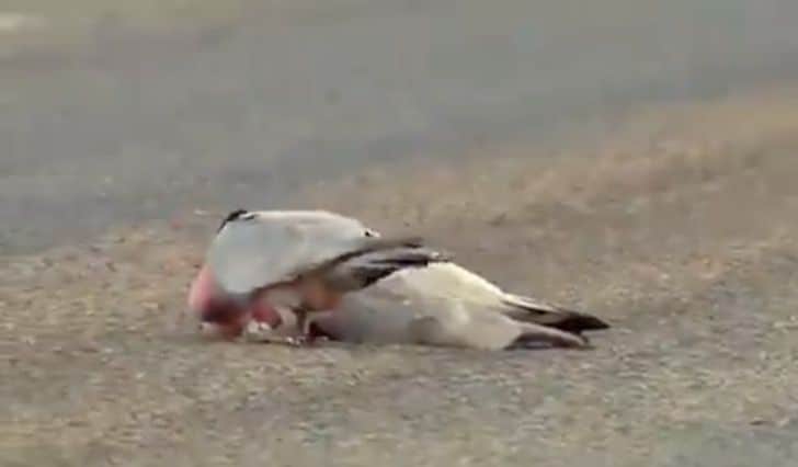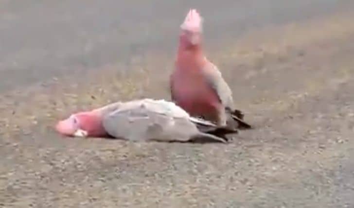 Isso aconteceu em um vídeo de uma cacatua de peito rosa, que ao ver seu parceiro falecido no meio de uma estrada, começa a circular em torno dele.