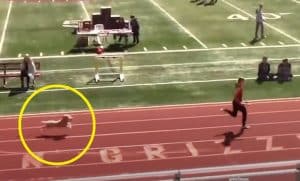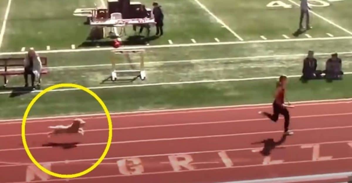 Na quarta e última volta da corrida, uma cachorrinha chamada Holly que estava observando tudo da plateia, não resistiu à tentação de correr e, escapando do controle de seus tutores, ‘invadiu’ a pista de atletismo e se convidou para participar do revezamento também.