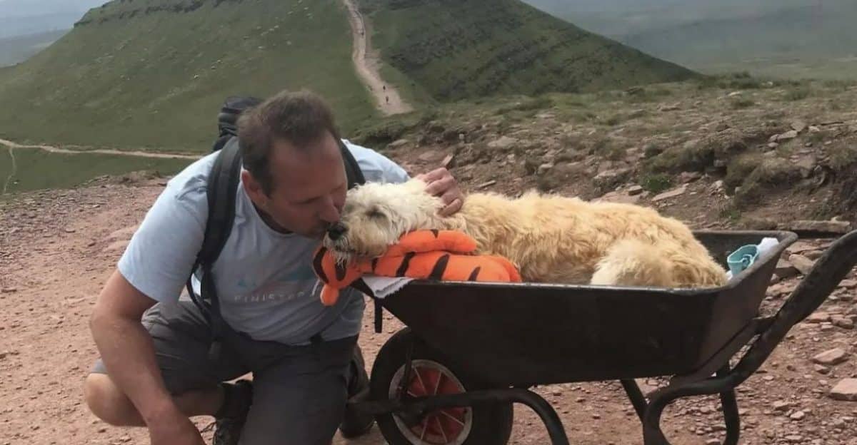 O hoteleiro sabia que Monty, de 10 anos (já idoso), não estava bem para subir os 2.900 pés do pico Pen-Y-Fan – então ele ajudou empurrando-o em um carrinho de mão.