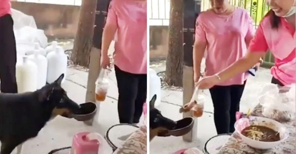 Em um vídeo que circula nas redes sociais, o cão é visto entrando com bastante confiança e se aproximando da cozinheira. Como se já tivesse pago adiantado, o cachorrinho aproxima a tigela.