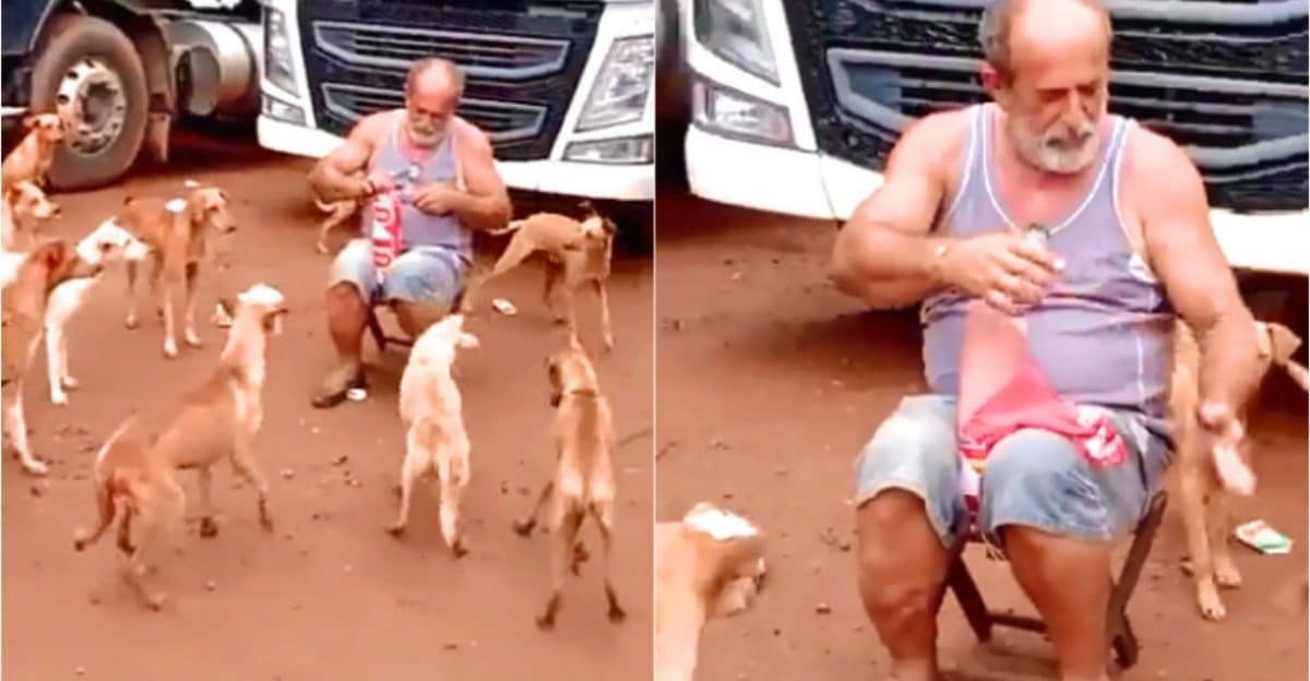 “É bonito demais de se ver”, completou. O caminhoneiro chama os cães de ‘Dudu’ e, rodeado deles, alimenta-os tranquilamente. Que atitude empática!