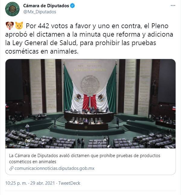 Há alguns dias, os deputados mexicanos decidiram endossar a proibição de testagem de produtos cosméticos em qualquer animal, depois que a Câmara dos Deputados aprovou parecer sobre a ata que reforma a ‘Lei Geral de Saúde para proibir testes cosméticos em animais’.