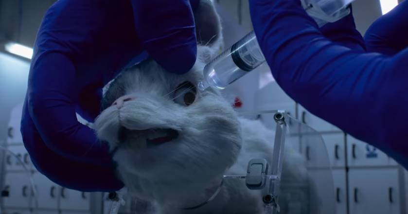 A peça de quatro minutos revela o lado sombrio e doloroso da indústria cosmética, que testa protótipos de produtos muitas vezes nocivos de forma indiscriminada em animais.