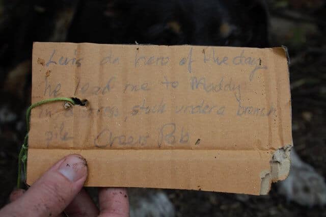 Na mensagem, o fazendeiro Rob Cheers, que mora próximo à Marolyn, comentou que Louie era um herói, pois sem sua ajuda ele não teria conseguido encontrar Maddy, sua cadelinha que estava presa em uma pilha de madeiras e não conseguia se libertar.