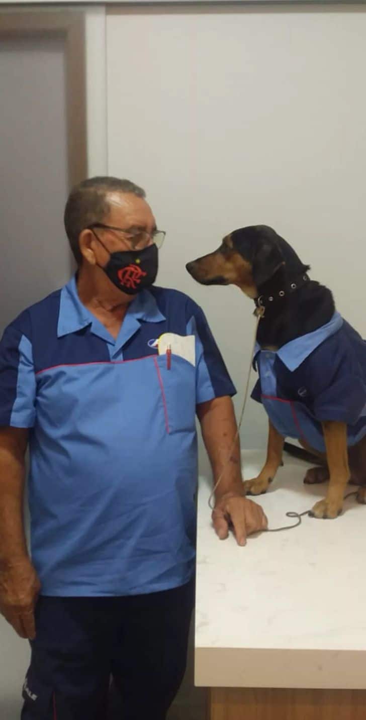Seu Antonio, 73 anos, é um dos funcionários mais próximos do cachorro. Ele gostava tanto dele que até o vestiu com o uniforme clássico que todo funcionário de posto de gasolina usa. Assim, Ulisses tornou-se um “trabalhador” mais.