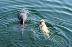 E ele não faz isso para se refrescar. Os turistas rapidamente começaram a notar que Ben estava visitando seu melhor amigo, um golfinho. Chamado Duggie, o cetáceo recebe seu amigo com prazer e depois dedica-se a nadar e brincar com ele a manhã toda.