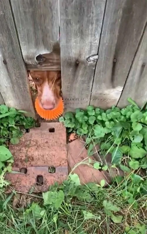 Jessica e sua família foram surpreendidas pelo focinho de um adorável cachorrinho que espiava pelo buraco na cerca do quintal enquanto desfrutava de um dia de piscina em família.