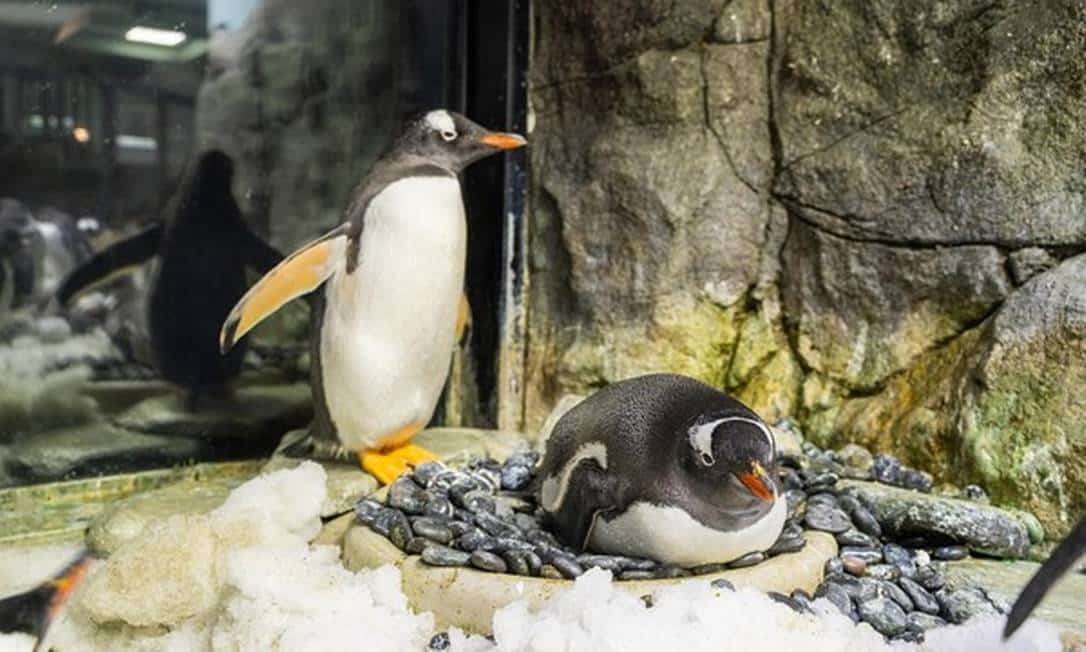 É exatamente neste local que o casal de pinguins vem montando seu ninho: na frente e no centro da janela de exibição. Eles já adotaram dois filhotes e, agora, a expectativa é de que assumam o terceiro.