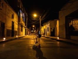 Criança reza de joelhos na rua pelo fim do coronavírus, durante toque de recolher no Peru