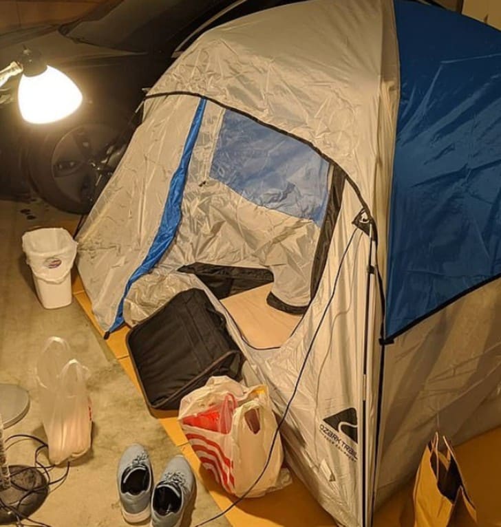 O Dr. Timmy Cheng decidiu erguer uma barraca em sua garagem, onde dorme todas as noites, sempre após os dias cansativos de trabalho no hospital.