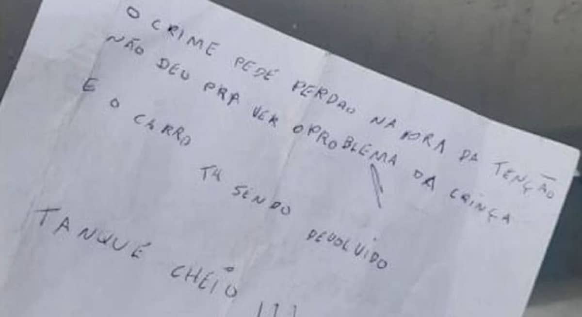 Logo depois, uma surpresa: o veículo foi devolvido com um bilhete: “O crime pede perdão. Na hora da tensão, não deu pra ver o problema da criança e o carro tá sendo devolvido. Tanque cheio!”.