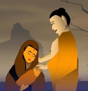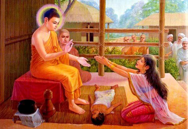 Krisha Gotami teve um filho e este morreu. Transida de dor, ia com o filho morto de casa em casa, pedindo um remédio, e as pessoas diziam:
