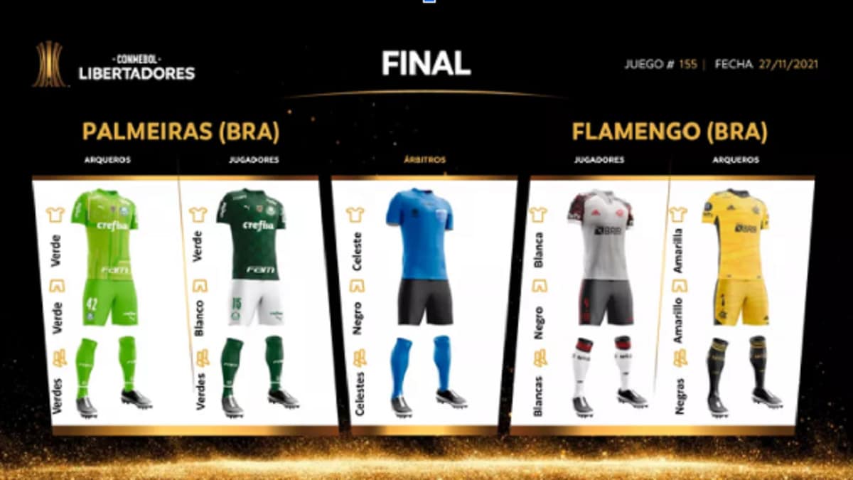 Pelo segundo ano consecutivo, o Brasil vai contar com dois times na final da Libertadores. A partida está marcada para o dia 27 de novembro, em Montevidéu, no Uruguai. Agora, a Conmebol comunicou os uniformes que os jogadores de Palmeiras e Flamengo vestirão no confronto mais importante entre clubes na América do Sul.