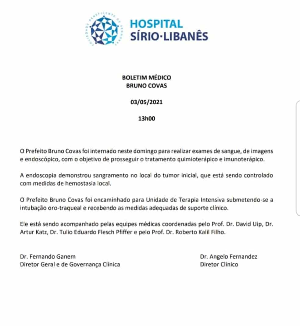 Conforme noticiado pelo site G1, o prefeito licenciado de São Paulo, Bruno Covas (PSDB), foi intubado e transferido para a Unidade de Terapia Intensiva (UTI) do hospital Sírio-Libanês, no Centro da capital paulista, após a descoberta de um sangramento no estômago, na manhã desta segunda-feira (3).