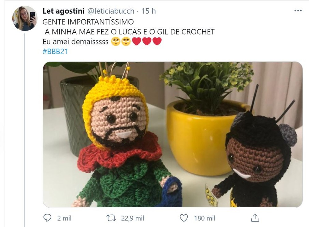 Uma das pessoas influenciadas foi, sem dúvida, a crocheteira Lilian Bucch, de Cornélio Procópio, no norte do Paraná, fez bonecos em homenagem aos participantes Lucas Penteado e Gilberto Nogueira, do “BBB21”, e uma postagem da filha dela com a foto do trabalho viralizou nas redes sociais no domingo (7).