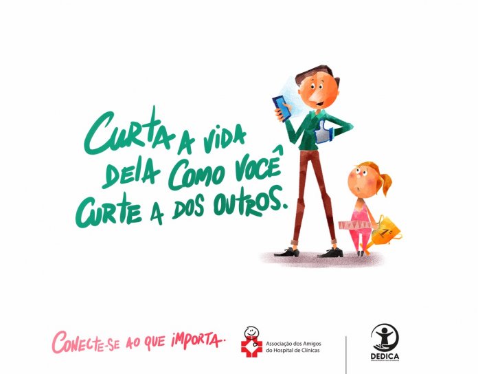 Os desenhos nos falam do grande tempo que a nossa geração passa no celular e no computador, desprezando inconscientemente a companhia, a presença dos filhos.