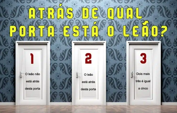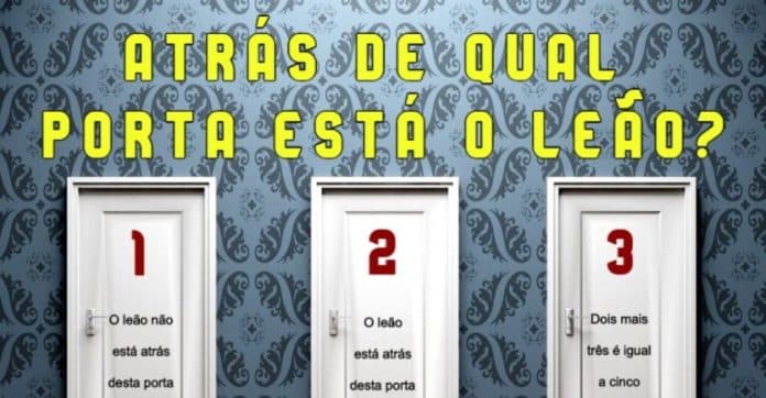 O desafio é simples: um leão está escondido atrás de uma das três portas, e em cada uma delas há uma frase. No entanto, apenas uma dessas frases é verdadeira. A questão é: em qual porta está o leão?