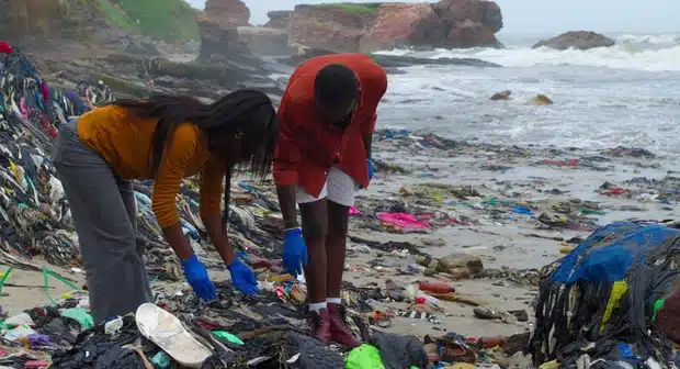 Imagens impactantes mostram praias em Gana cobertas por roupas descartadas e depósitos de lixo eletrônico em países em desenvolvimento, evidenciando o destino dos produtos após seu curto ciclo de vida.