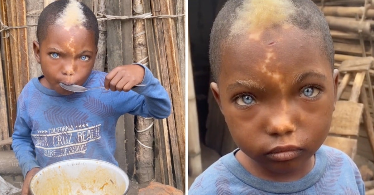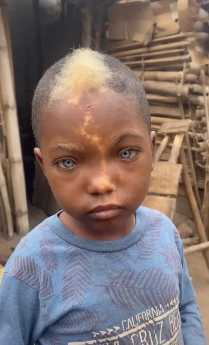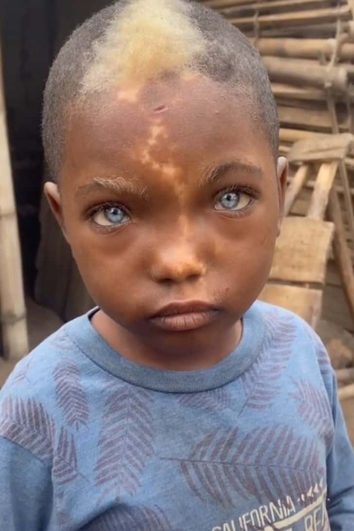De pele morena, belíssimos olhos azuis, uma marca de nascença em forma de raio e cabelos loiros na região central da cabeça, o menino chama a atenção por onde passa.