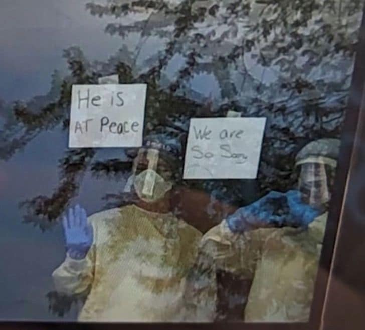 Mas o distanciamento social, já tão doloroso naquele momento, tornou a situação ainda mais difícil: as enfermeiras tiveram que noticiar aos filhos a morte do pai e a forma encontrada foi pela janela do quarto, onde fixaram cartazes com os dizeres: “Ele está em paz” e “Lamentamos muito”.